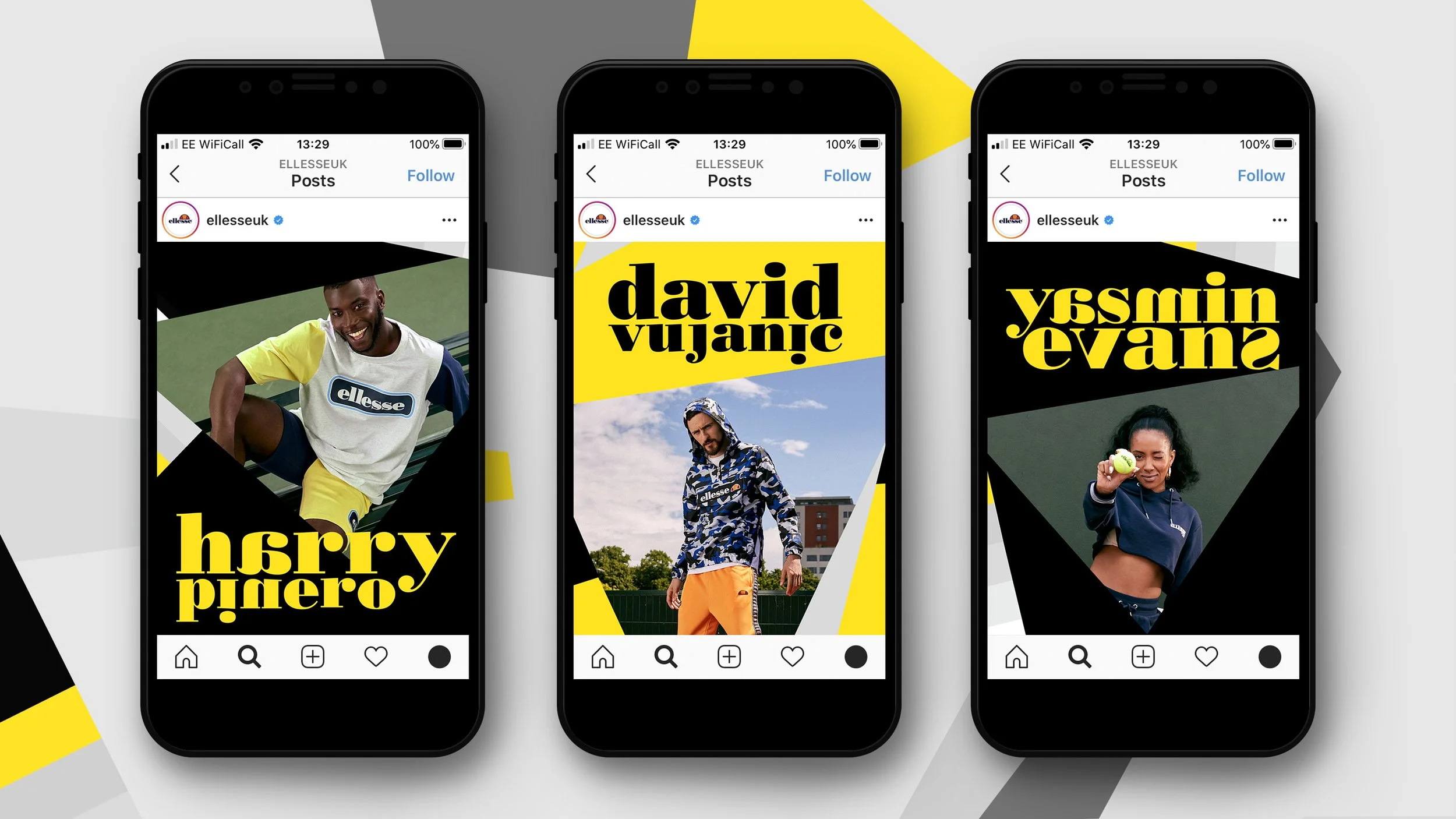 A crew of influencers were brought together to deliver a social content campaign that culminated in a pop-up event in London’s Soho, where custom-designed Ellesse products were given away. I was responsible for implementing the graphics across the digital aspects of the campaign.